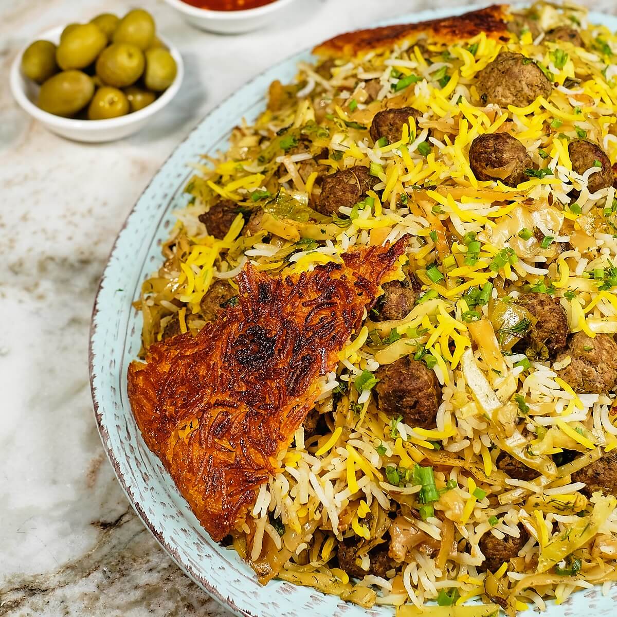0 Prep the Rice: Rinse the rice 4–5 times until the water runs clear. Drain well and soak in fresh water for at least [timer minutes=60]1 hour.[/timer] 1 Make the Meatballs: Squeeze excess liquid from the grated onion using a sieve. Combine the onion with ground meat, salt, turmeric, and black pepper. Knead until smooth. Shape into small, hazelnut-sized meatballs (about 60–65 total). [I divided the meat mixture into four portions, then divided each portion into 16 to make a total of 64 meatballs.] 2 Brown the Meatballs: Heat 1 tablespoon oil in a skillet over medium-high heat. Add the meatballs and cook until golden brown on all sides, about [timer minutes=4]4 minutes[/timer], shaking the pan occasionally. Set aside. 3 Sauté the Cabbage Mixture: Heat 3 tablespoons olive oil in a large pot or wok over medium-high heat. Add cumin seeds and sauté until aromatic, about [timer minutes=0.25]15 seconds[/timer]. Add grated ginger and sauté until aromatic, about [timer minutes=0.5]30 seconds[/timer]. Then add red pepper flakes and advieh and stir briefly. Add cabbage and cook until wilted but still slightly crisp, about [timer minutes=5]5–6 minutes[/timer]. Season with salt. Stir in the meatballs, dill, cilantro, basil, and chives. Remove from heat and set aside. 4 Parboil the Rice: In a large pot, bring 8 cups of water and 1½ tablespoons salt to a rolling boil. Add the soaked rice and cook uncovered for [timer minutes=5]5–6 minutes[/timer] on high heat, until the grains are slightly tender but still hold their shape, stirring occasionally. Drain immediately using a colander and set aside. 5 Prepare the Tahdig: Heat 2 tablespoons butter or oil in a nonstick pot over medium heat. In a bowl, gently mix 1 cup cooked rice, yogurt, and 1 tablespoon saffron water. Spread this mixture evenly over the bottom of the pot (about ¼-inch thick). Tip: Adjust the amount of oil, rice, yogurt, and saffron based on the pot size. 6 Layer the Rice: Spread ¼ of the rice in a layer, followed by ⅓ of the cabbage-meatball mixture. Repeat the layers 2 more times, finishing with rice on top. Drizzle the remaining olive oil and saffron water over the top. Poke a few holes in the rice with a wooden spoon. Wrap the lid with a kitchen towel (to absorb moisture) and place it firmly over the pot to create a tight seal. 7 Steam the Rice (Stovetop): Cook on medium heat for [timer minutes=10]10 minutes[/timer] to set the crust. Reduce to medium-low and steam for [timer minutes=30]35 minutes[/timer] until fully cooked and the rice at the edges turns crispy. Remove from heat and let rest for [timer minutes=5]5 minutes[/timer]. 8 Serve: Scoop some saffron rice from the top and set aside for garnish. Gently mound the rice onto a serving platter. Remove the crust (tahdig) and serve on the side. Garnish with herbs and the reserved saffron rice. Serve with Mast-O-Musir (yogurt with shallots), pickles, and Shirazi salad.View original recipe
