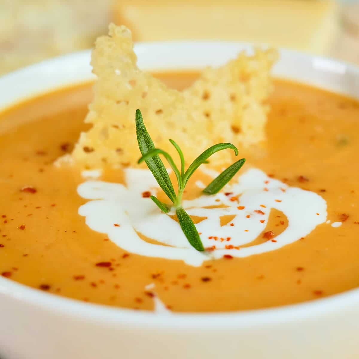 Full tutorial video above. This sweet potato soup is so creamy, delicious and perfect for holidays. Rich in taste with coconut milk, ginger, cardamom, nutmeg, rosemary and topped with parmesan crisps. So festive and comforting!